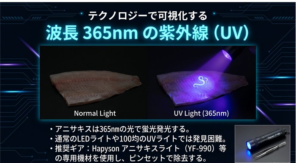 ホウボウの透明な白身に紛れたアニサキスを見つけ出すには、文明の利器を頼るのが最も賢明です。最近では、特定の波長の紫外線を当てることでアニサキスを光らせる「専用UVライト」が普及しています。メーカーの技術データによれば、365nm(ナノメートル)という特定の波長が、アニサキスの体表を最も効率よく発光させるとされています。これに専用のピンセットを組み合わせることで、身をボロボロにすることなく、確実に異物を取り除くことが可能になります。
