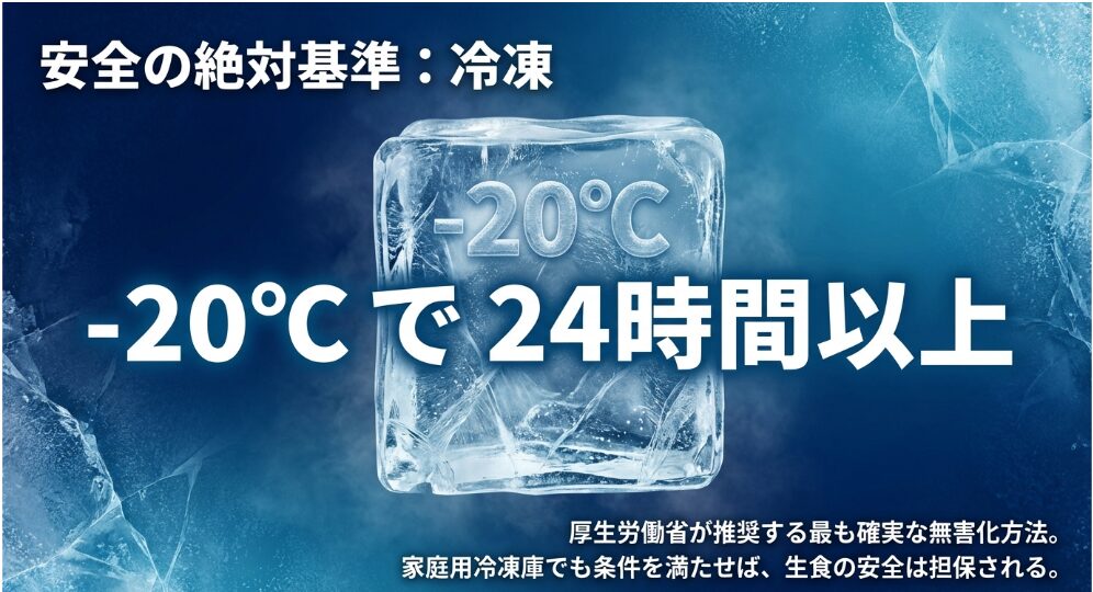 | 3.完全冷凍 | 家庭用冷凍庫で48時間以上、芯まで凍らせる | 厚労省基準(-20℃/24h)を家庭環境で確実に達成するため |