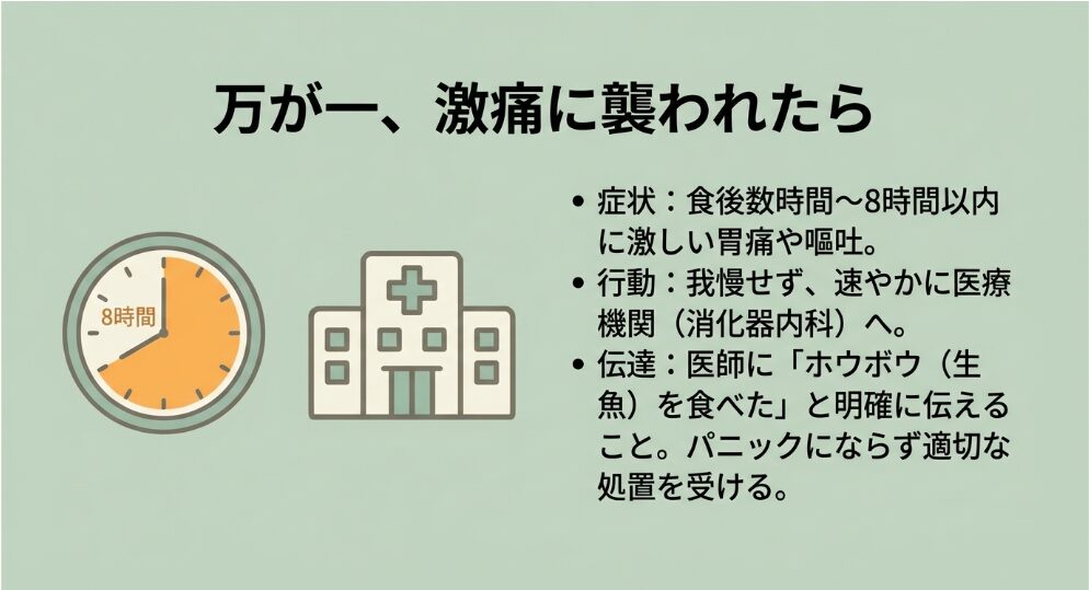 もし、周期的に襲ってくる激痛を感じた場合は、決して自己判断で市販の鎮痛剤などを飲んで我慢しないでくださいね。専門機関の指針では、速やかに医療機関(消化器内科など)を受診し、「生のホウボウを食べた」と明確に伝えることが推奨されています。内視鏡による摘出が最も確実な治療法であり、適切な処置を受ければ速やかに痛みは解消されることが報告されています。パニックにならず、まずはご自身の体調の変化を冷静に観察してくださいね。