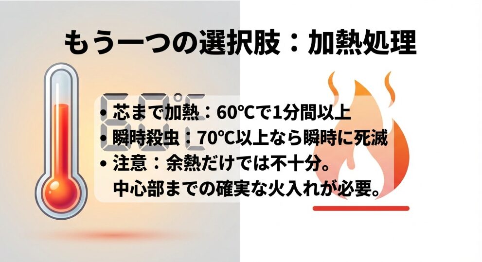 | 加熱調理 | 60℃で1分以上 / 70℃以上 | 極めて有効(中心部まで) |