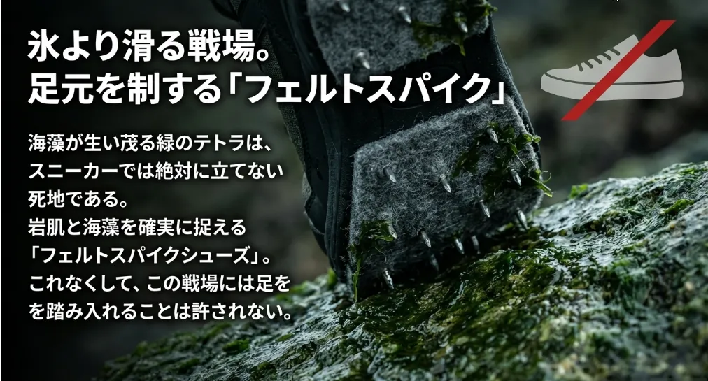 | 足元の命綱 | プロマリン フェルトスパイクシューズ | ぬめりがあるテトラでも、ピンが食い込み滑落を防止。 |