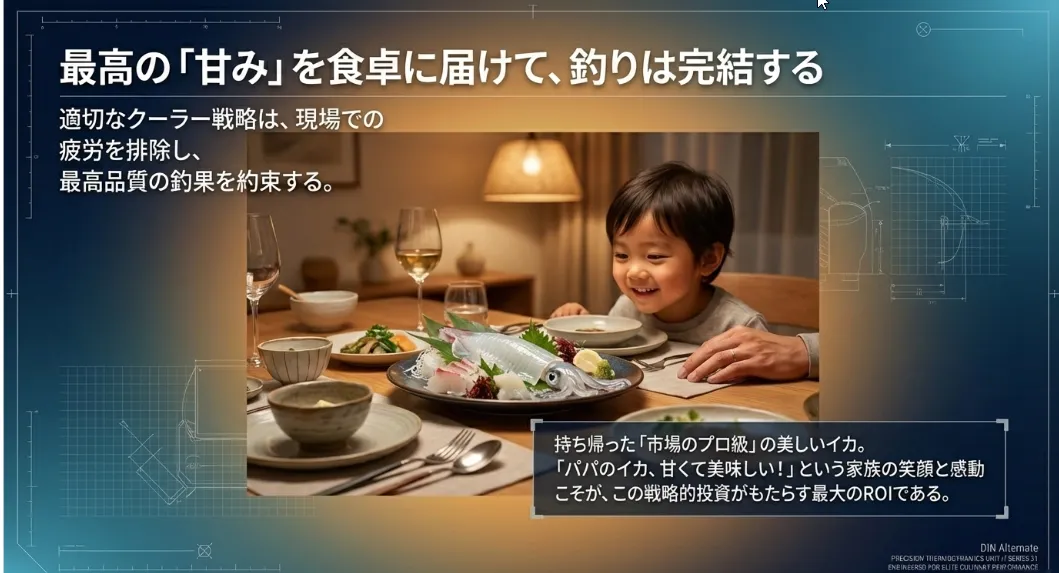せっかく夜通し頑張って釣った最高の獲物も、保存の変数を一つ間違えるだけで、翌朝には白く濁った「残念なイカ」に変わってしまいます。家族に「パパが釣ってきたイカは世界一だね!」と言わせるために、現場のプロが命を懸けるクーラー戦略の核心をお伝えします。