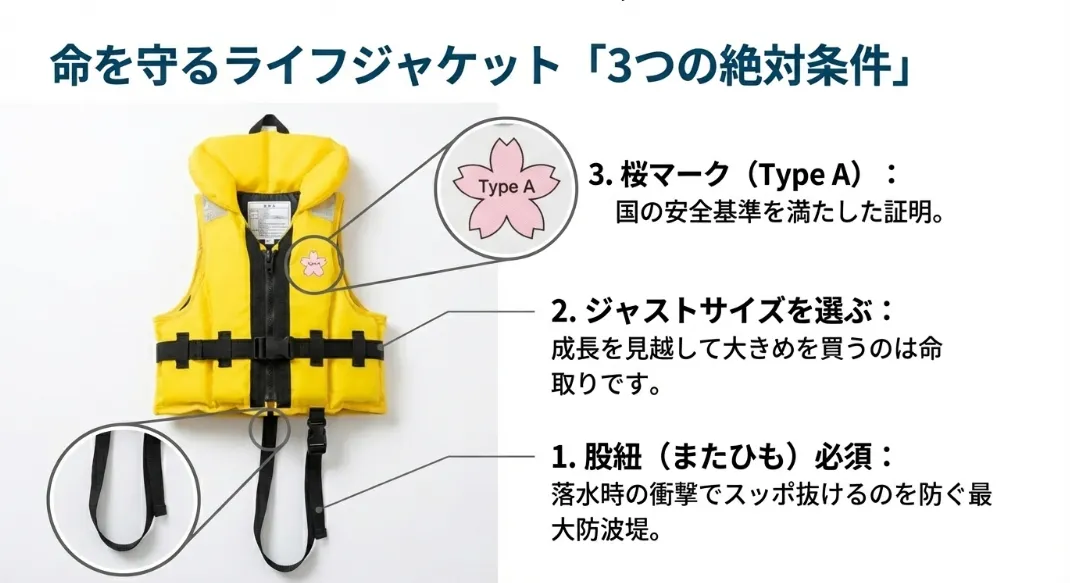 ライフジャケットを着せる際、意外と忘れがちなのが「股紐(またひも)」です。これを通していないと、万が一落水した時にジャケットだけがスポッと抜けてしまいます。専門機関のデータでも、正しい着用が命を守る鍵であることが証明されています。「窮屈そうだから」と緩めず、しっかり装着してあげてくださいね。