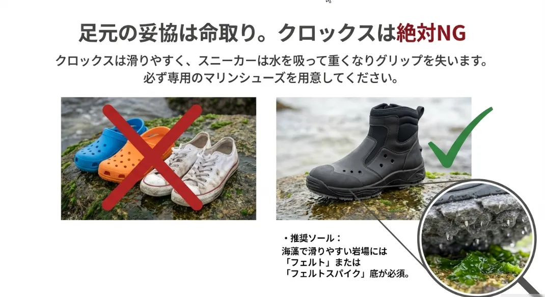 普通の運動靴やサンダルでは、プロでも立っていられません。そこで重要になるのが「ソール(靴底)」の選択です。行く場所の岩の状態に合わせて靴を選べば、転倒のリスクを劇的に減らすことができますよ。