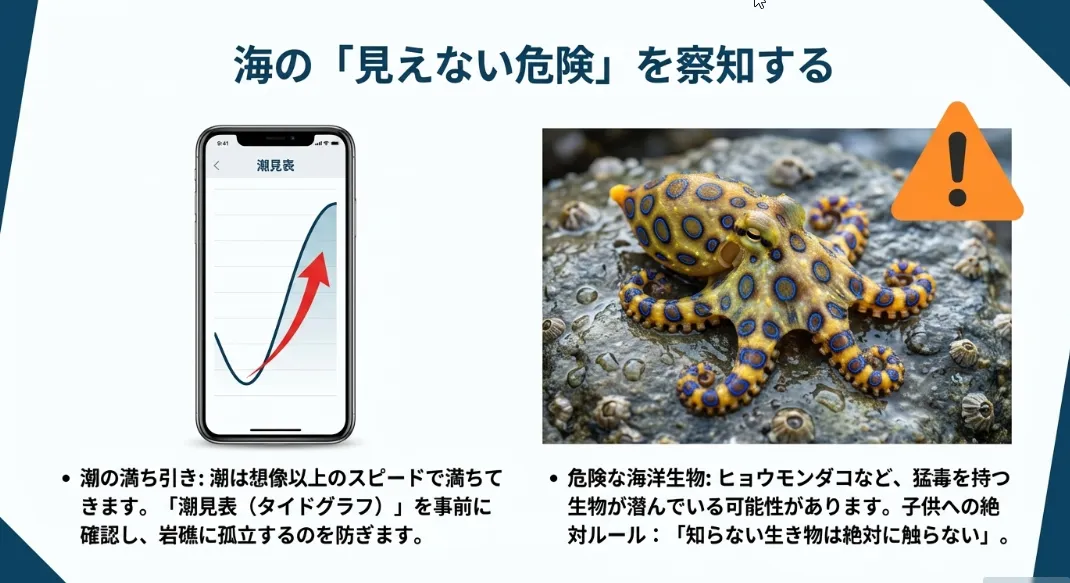 海には「潮汐(ちょうせき)」というリズムがあります。これを知らずに磯へ行くのは、地図を持たずに砂漠へ行くようなものです。安全に、そしてたくさんの生き物に出会うためには、常に最新の情報を手元に置くのがパパの役割ですね。
