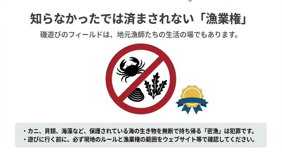 磯はみんなの遊び場ですが、同時に漁師さんたちが大切に育てている漁場でもあります。ルールを知らずに楽しむのは、プロの遊び方ではありません。「知らなかった」でせっかくの思い出を台無しにしないよう、マナーもしっかり確認しておきましょう。