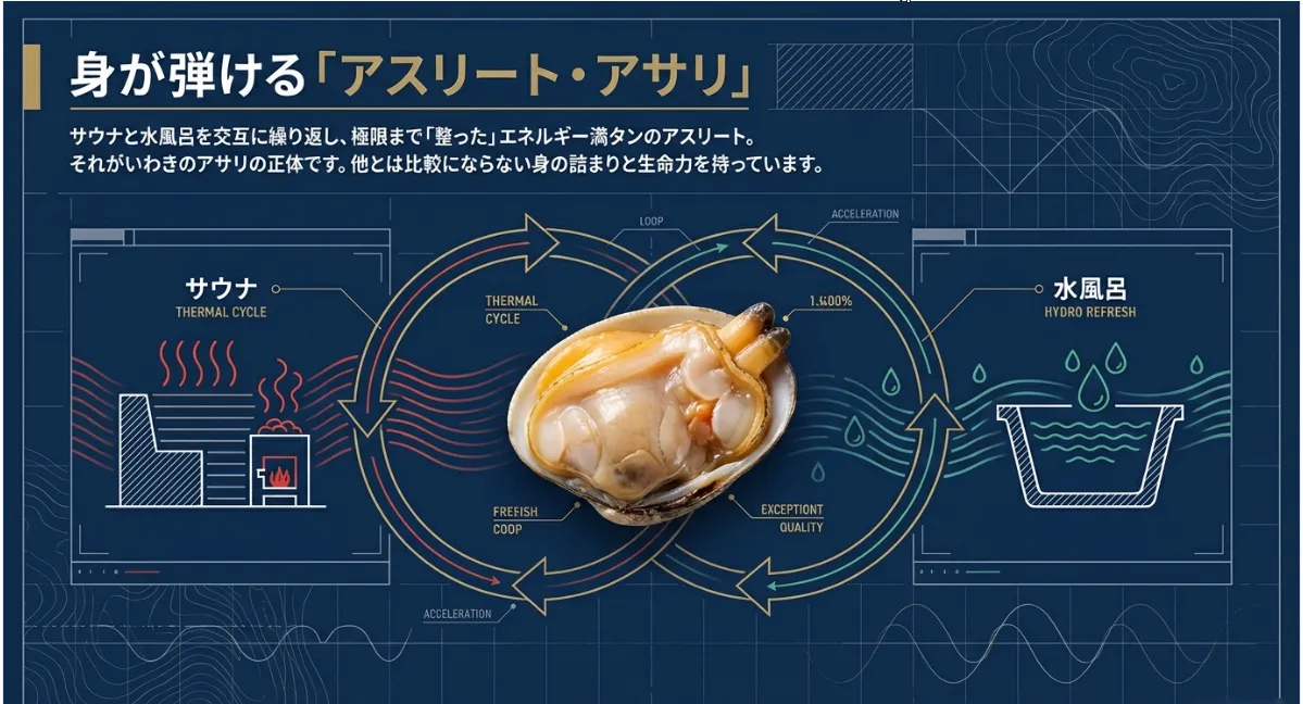 言ってみれば、最高級の食事を摂りながら、温暖なジムでトレーニングを積んでいるようなもの。だからこそ、いわきの貝は内臓までパンパンに張りがあり、甘みが強い「アスリート仕様」の肉質に仕上がるわけです。この「潮目のサイクル」がいわきという変数がもたらす最大の恩恵ですね。