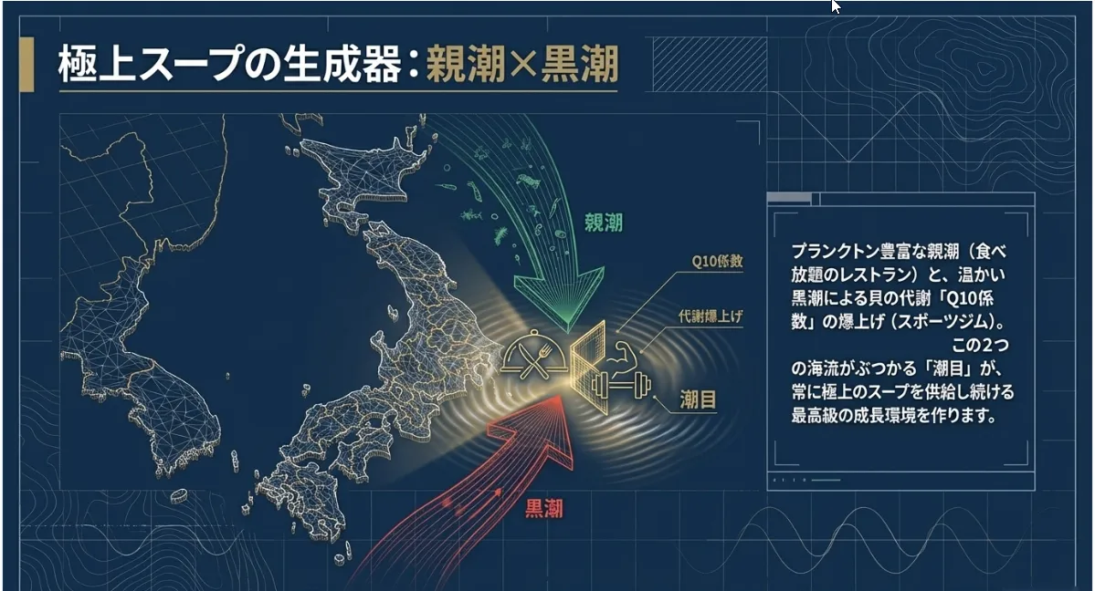 親潮と黒潮が交差する「潮目の恵み」で貝の身が太る理由