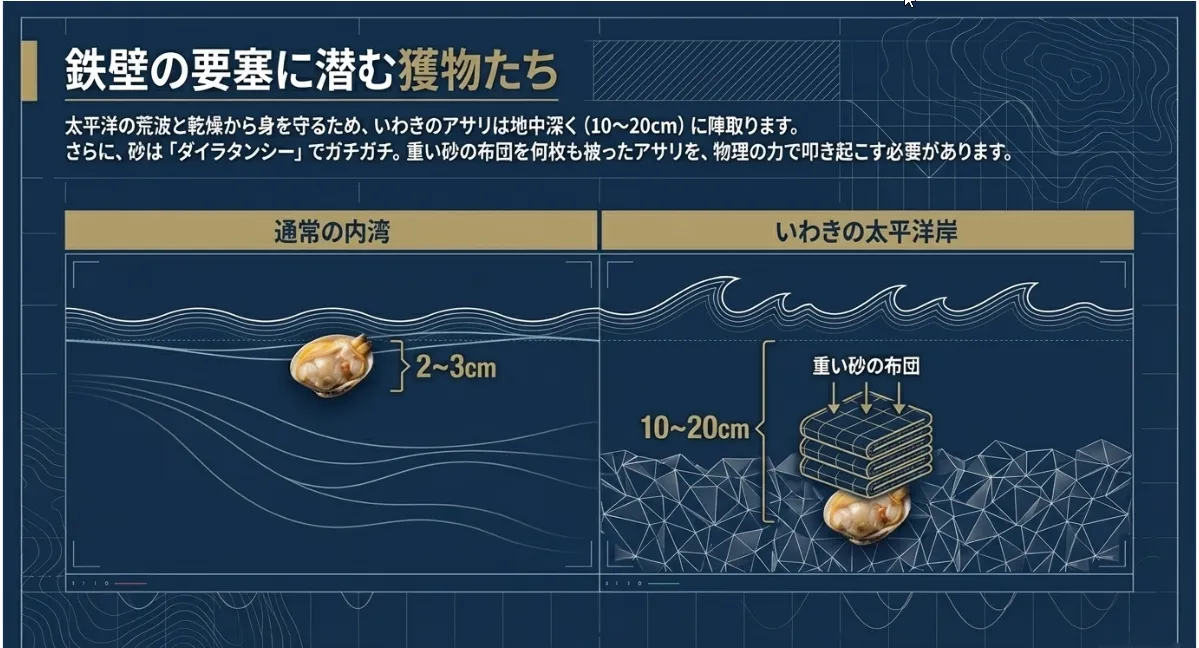 太平洋の荒波が作り出した硬い砂地と、急激に変化する水温。これらは貝たちの生態を劇的に変え、攻略の難易度を跳ね上げています。でも、だからこそいわきのアサリは、他の地域では絶対にお目にかかれないほど「身がパンパン」で美味いんです。今回は、この太平洋の物理法則をハックして、最高の恩恵を手に入れるための「ガチの攻略法」を伝授しますね。