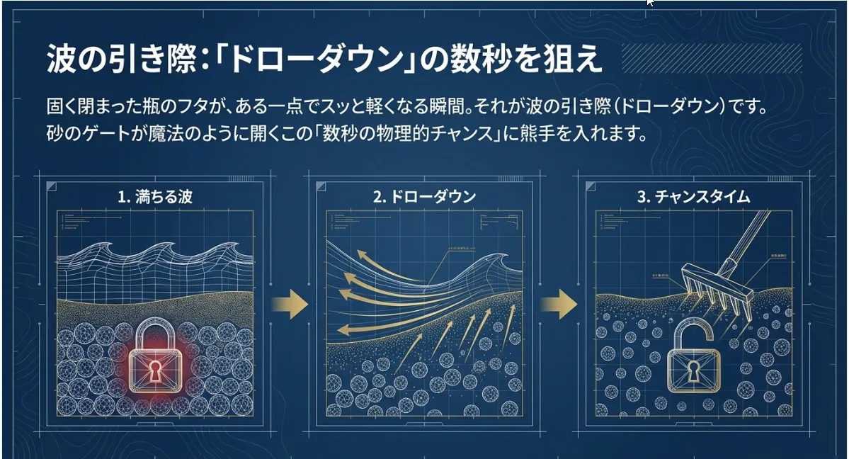硬く締まったいわきの砂地に熊手を突き立てるのは重労働ですが、実は「物理的な裏口」があります。それが波の周期です。大きな波が来て、それが沖へ引き返す瞬間(ドローダウン)を狙ってください。