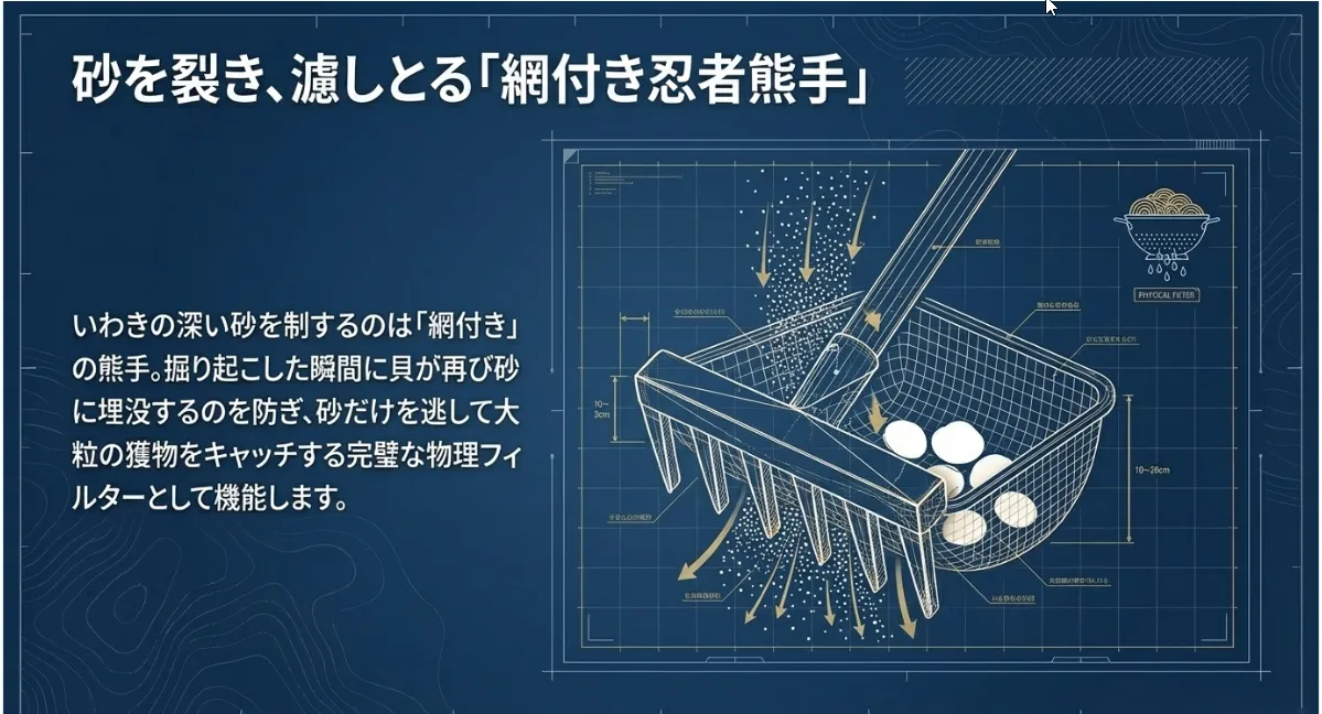 普通の熊手では、いわきの砂の抵抗に負けて指が曲がってしまったり、せっかく掘り出した貝を砂と一緒に逃してしまったりします。そこで、網付きで、なおかつ耐久性の高い「忍者熊手」が必須となります。砂粒子を網で素早く逃がし、貝だけを「物理的にフィルタリング」する。この効率化がいわきを制する鍵です。