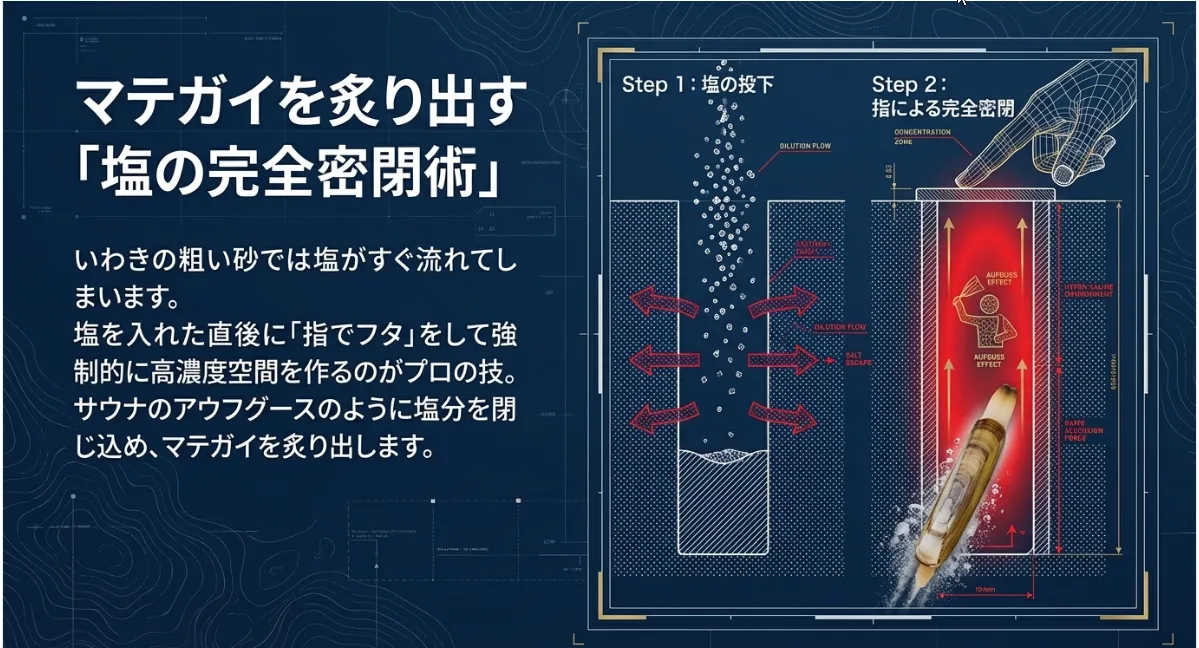 いわきではマテガイも人気ですが、こいつらも一筋縄ではいきません。砂の粒が大きいため、塩を振りかけてもすぐに海水で流れて薄まってしまいます。成功のコツは、塩を入れた直後に指で穴を塞ぎ、一時的に「高濃度な塩分空間」を密閉すること。そのために、片手でピンポイントに塩を噴射できる専用ボトルが強力な武器になります。