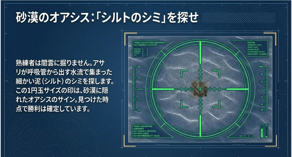 深い層に潜む大型貝を仕留めるための、具体的な掘削角度とコツを深掘りしています。