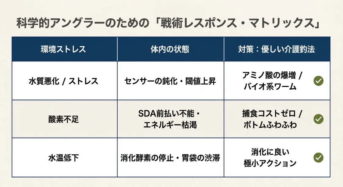 魚のわがままではなく、水温や酸素量によって「食べたくても食べられない」安全装置が働いています。この記事では、その装置を解除して口を使わせる具体的な突破策を伝授しますね。