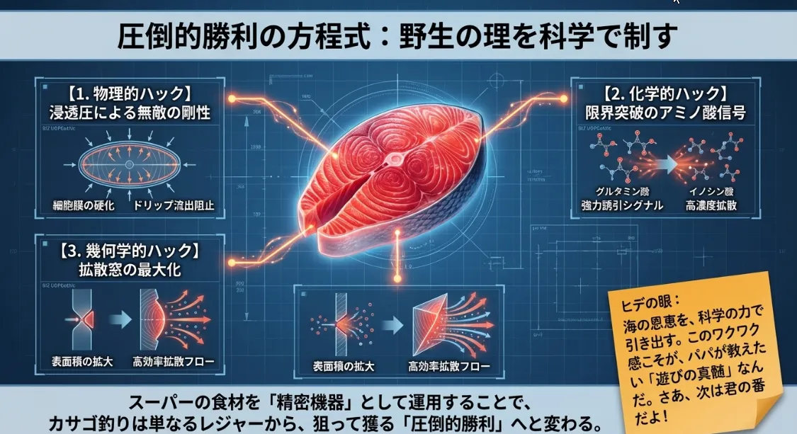 スーパーのサバはそのままだと柔らかすぎて、針から外れやすいのが弱点。そこで「浸透圧脱水」を利用した塩締めが重要になります。身に塩を振ると、細胞内の水分が外へ吸い出され、筋肉タンパク質(ミオシンなど)が凝集します。これにより、組織の密度が上がり、グミのような絶妙な弾力が生まれます。これが、岩にぶつかっても千切れない「最強の針持ち」の正体です。