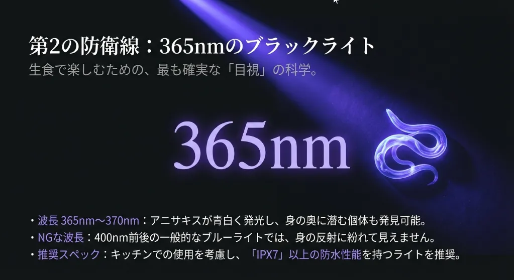• 波長365nm〜370nm:この範囲の光が、最も鮮明にアニサキスを光らせます。