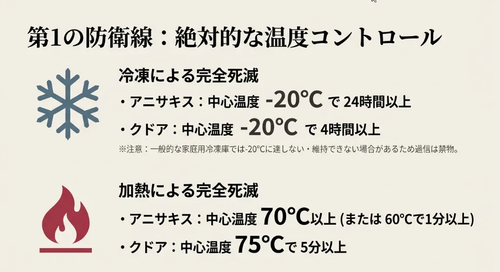 家族の安全を守るために、キハダマグロを扱う際は以下の「科学的な死滅条件」を絶対に守ってくださいね。これを守れば、アニサキス症のリスクはゼロになります。