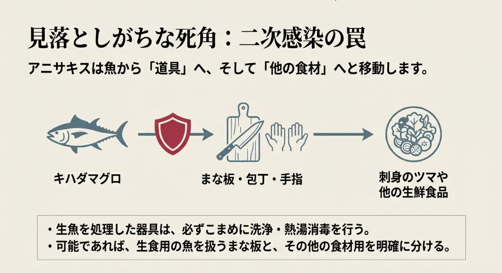 キハダマグロ自体がクリーンであっても、調理環境が原因でアニサキス食中毒が起こるケースがあります。これが「二次汚染(クロスコンタミネーション)」です。東京都保健医療局の注意喚起によれば、寄生率の高い他の魚を調理した後の器具を介して、アニサキスがキハダマグロに移ってしまうことがあるのです。