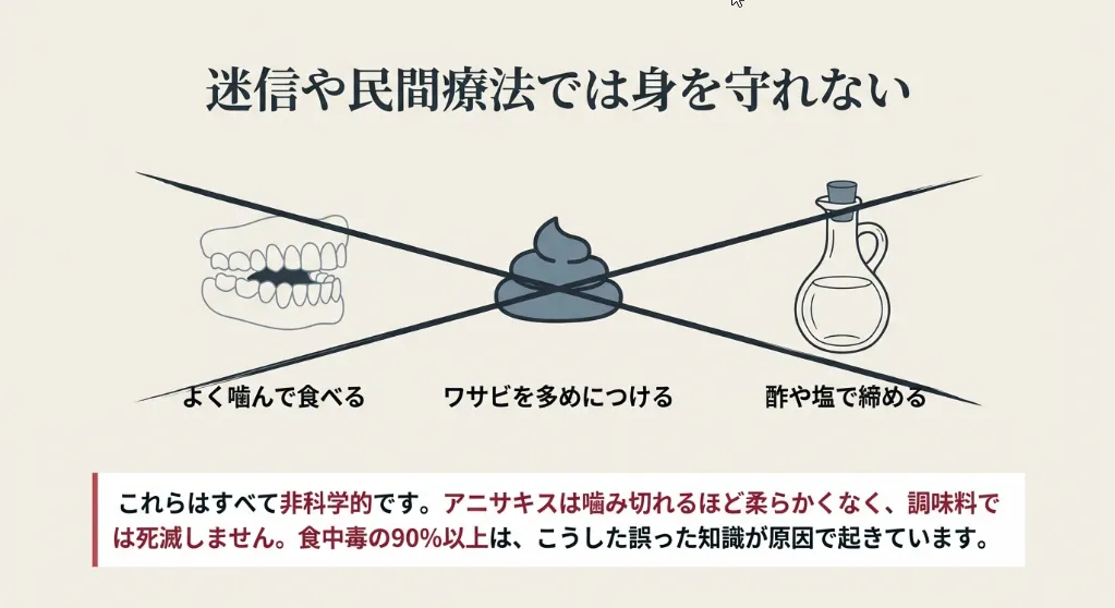 ここがパパとして一番伝えておきたいポイントです。「お酢で締めれば大丈夫」「醤油に浸せば死ぬ」といった昔ながらの知恵は、あくまで味付けの話。厚生労働省の広報資料によると、一般的な料理で使う程度の酢、醤油、ワサビ、生姜では、アニサキスは死滅しないという結果が出ています。彼らは意外とタフなんですよ。