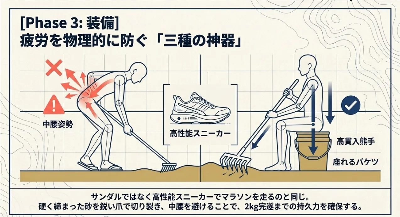 木更津の広大な干潟をハックするには、道具選びで妥協しちゃいけないよ。特に「腰痛対策」と「砂層の貫入力」を重視した厳選アイテムを比較してみたからね。これがあるだけで、潮干狩りの快適さが物理的にガラッと変わるはずだよ。