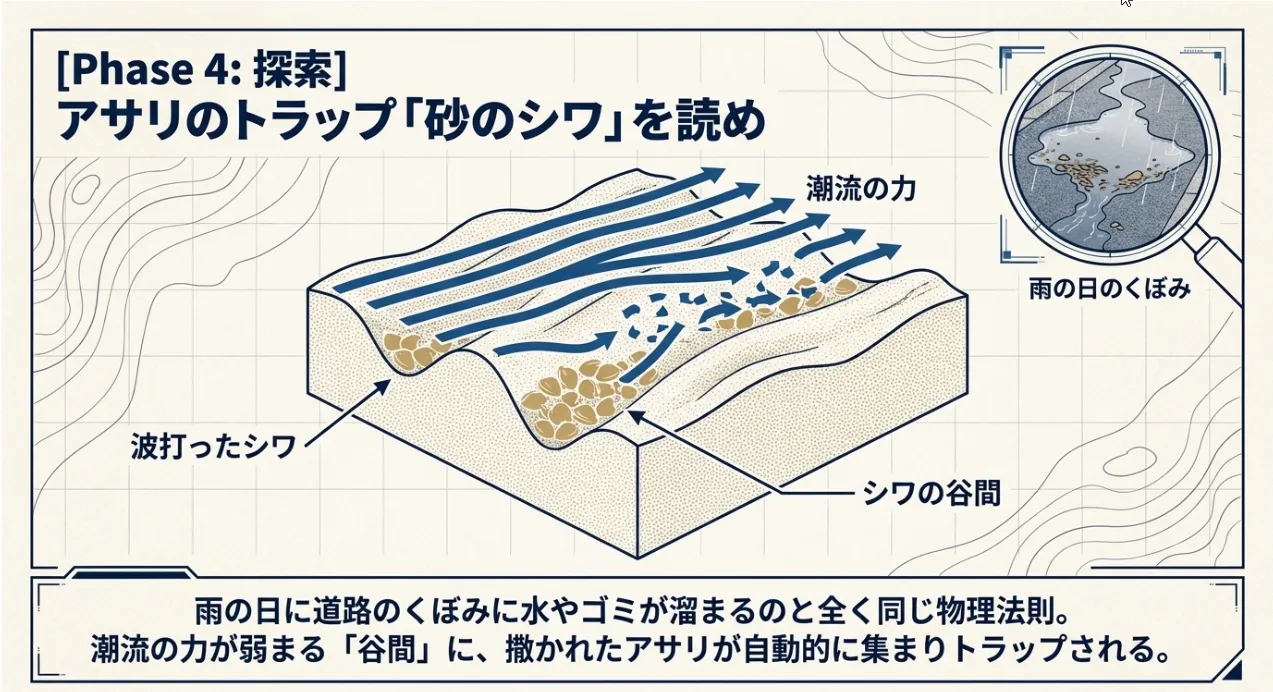 砂の「シワ」を見ろ!撒き貝が溜まる物理的なパッチの探し方