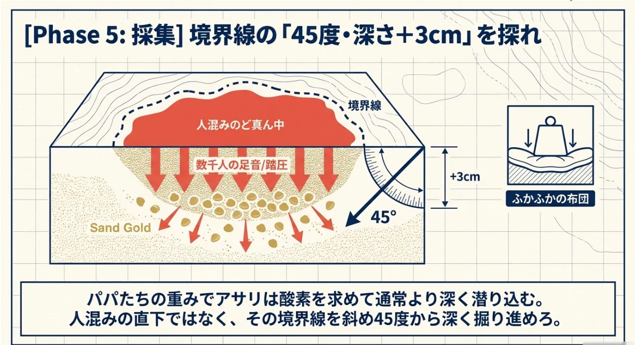 大勢の人が歩くと、その重み(踏圧)で貝は通常よりも数センチ深く潜ってしまいます。人混みの中心は避け、そのすぐ隣のエッジ部分を、45度の角度で深く探るのが大漁を掴む正解ですね。