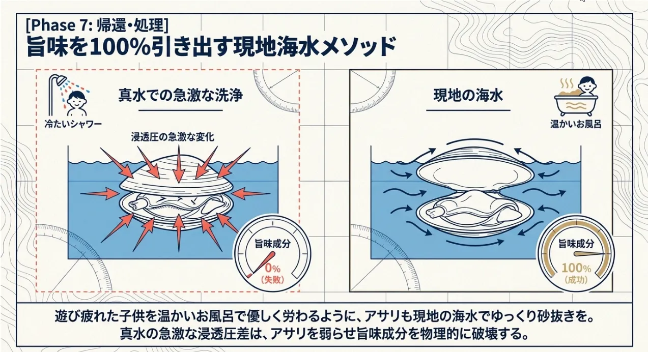 貝は急激な環境変化に弱いんだよ。持ち帰る際は、木更津の海水をペットボトルに入れて持ち帰り、その海水を使って家で砂抜きするのが一番なんだ。真水で洗ってしまうと浸透圧の差で弱ってしまうからね。クーラーボックスに氷を入れる時は、直接貝に触れないようにして、「ゆっくりと温度を下げる」のが物理的に鮮度を保つコツなんだよ 。