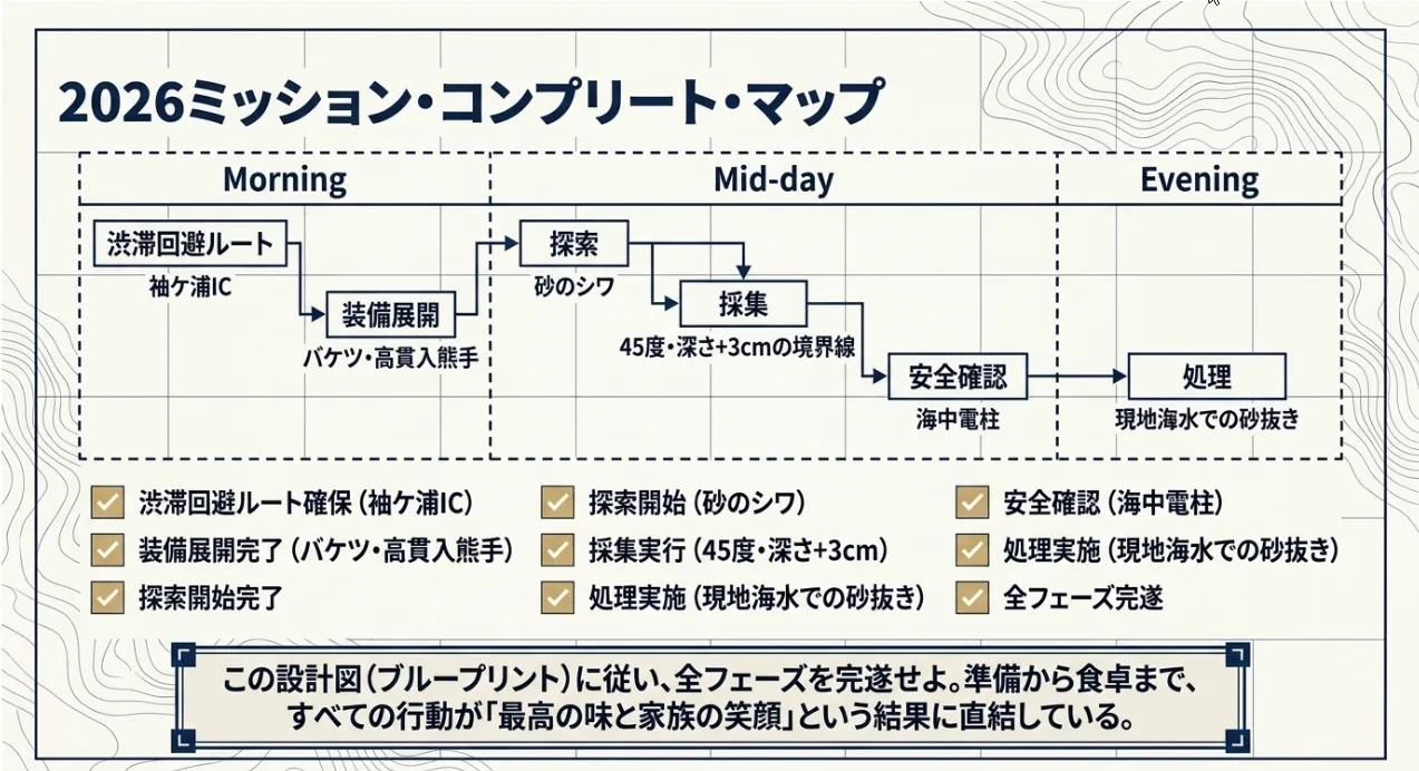 渋滞を賢く回避する袖ケ浦ルートの活用と、人の重みで沈んだ貝を掘り当てる「深掘り術」が、2kg完遂のための絶対条件になりますよ。