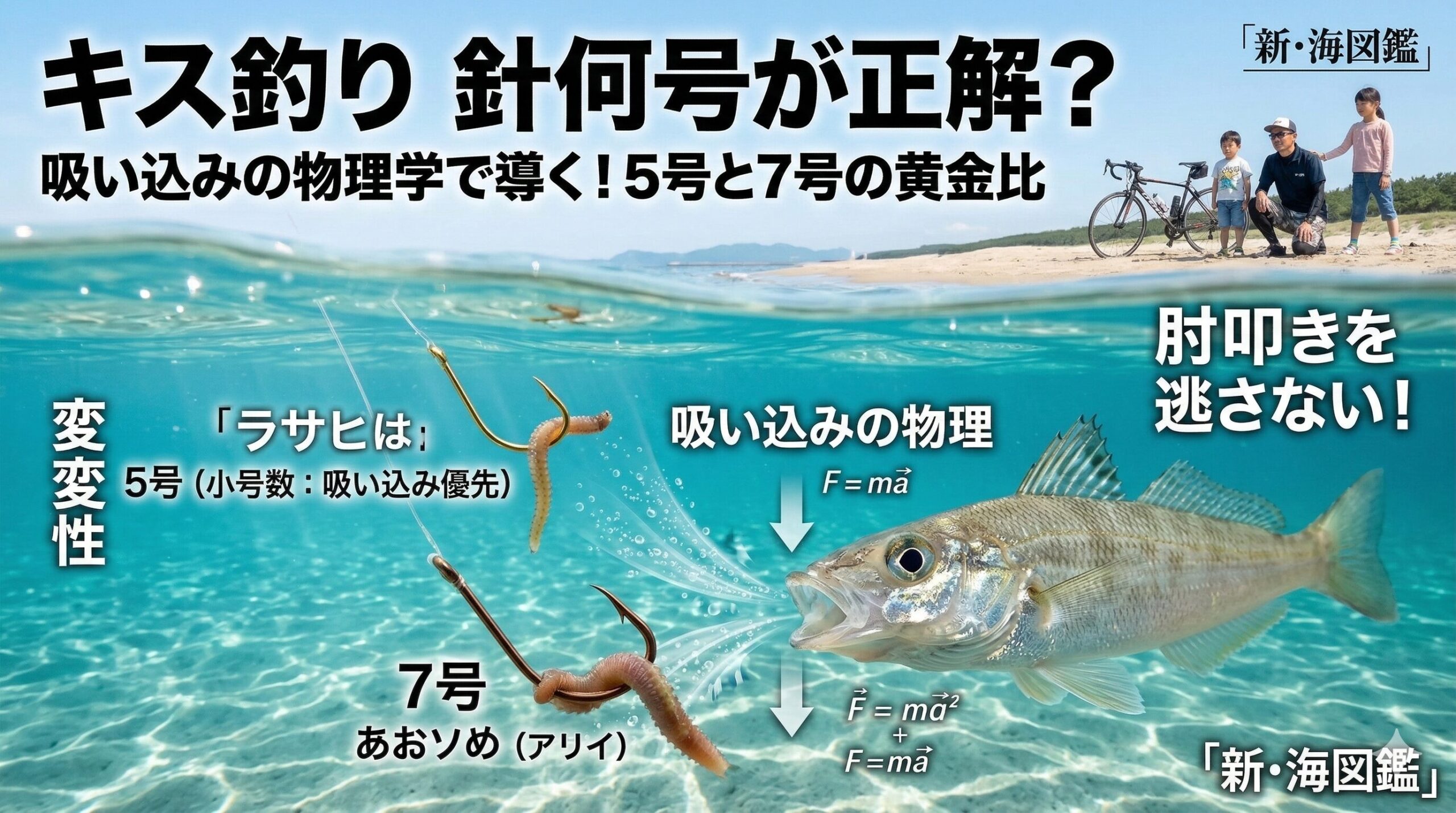物理学の世界には「運動方程式(F=ma)」という考え方があります。シロギスが餌を吸い込む力(F)が同じなら、針の質量(m)が小さいほど、加速度(a)は大きくなります。つまり、号数が小さい(=軽い)針ほど、キスが口を開けた瞬間にハイスピードで口の奥まで到達するということです。