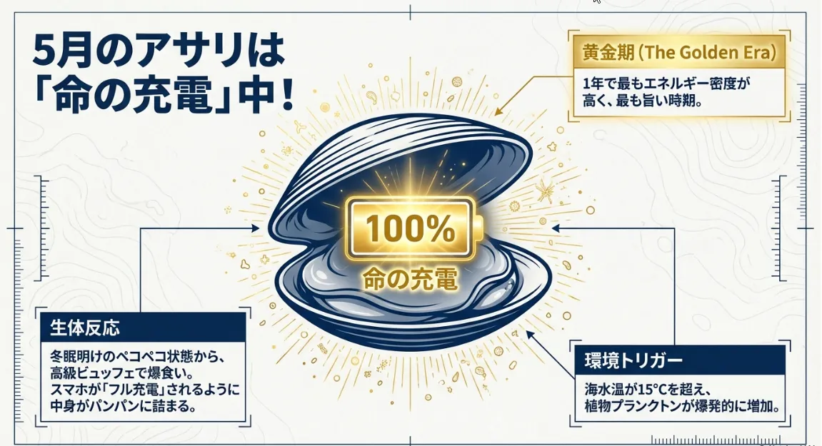 5月のアサリが特別な理由。それは、スマホのバッテリーが100%になる「フル充電」の状態だからです。冬の間、冷たい水の中でじっと耐えていたアサリたちは、春の訪れとともに爆発的な勢いで栄養を取り込み始めます。