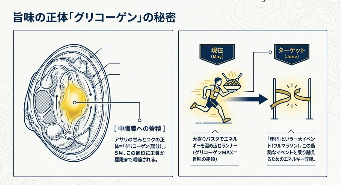 5月のアサリを食べたとき、独特の「甘み」と「コク」を感じませんか?その正体は「グリコーゲン」という糖の一種です。6月以降に控えた「産卵」という一大イベントに向けて、アサリは自らの体内にこのエネルギー源をギッシリと溜め込みます。