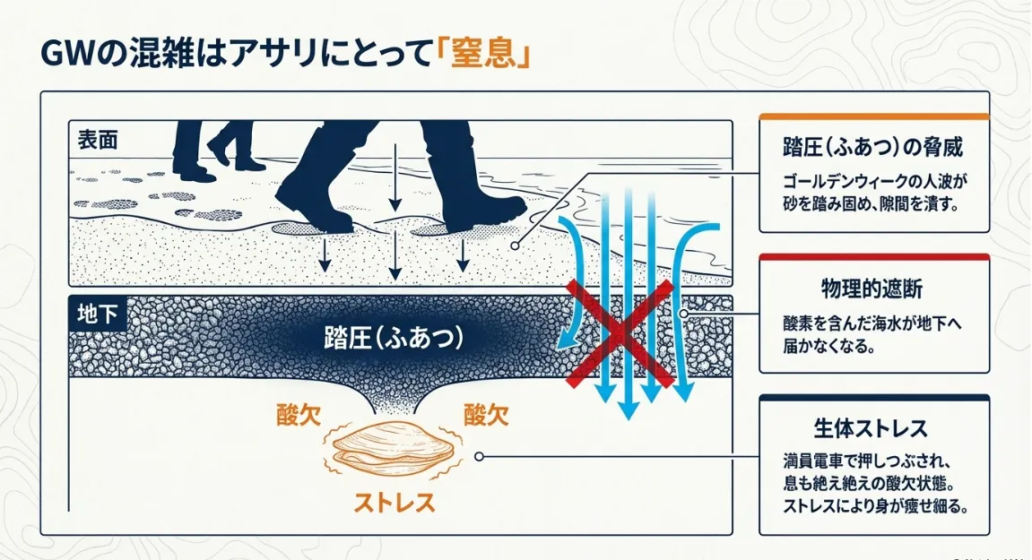 ところが、この「最高に旨い時期」には、ある大きな物理的な障害が立ちはだかります。それが、GWに集中する数万人もの人間による「踏圧(ふあつ)」、つまり足で踏みつける力です。これがアサリにどんな影響を与えるか、考えたことはありますか?