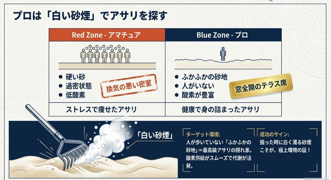 では、どこを狙えばいいのか。答えはシンプル。「人が歩いていない、砂がふかふかな場所」です。掘った瞬間に注目してください。水中で砂が「白く煙るように舞い、すぐに沈降する」場所。そこは酸素供給がしっかり行われている、アサリにとっての超優良物件です。こうした場所には、グリコーゲンをたっぷりと蓄えた、ストレスのない「勝ち組アサリ」が集まっています。