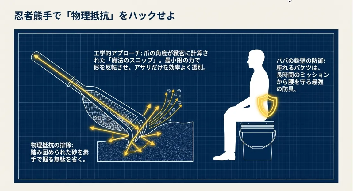 5月の潮干狩りは、強烈な紫外線と硬い砂地、そして長時間の中腰姿勢との戦いです。パパが翌日に「腰が痛い……」とならないために、そして効率よくお宝を見つけるためのギアを比較しました。