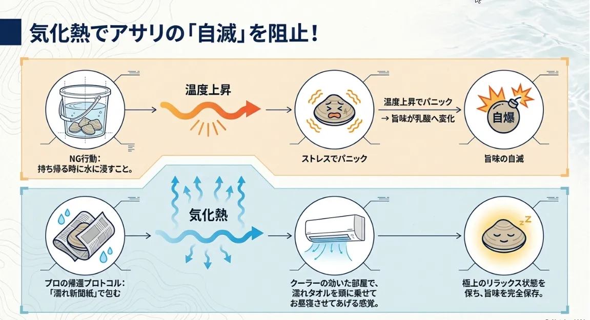 持ち帰る時は、水に浸したままにするより「濡れた新聞紙」で包むのがプロの技。水が蒸発する時に周囲の熱を奪う「気化熱」の原理で、貝の温度を一定に保てます。これをクーラーボックスに入れれば完璧。アサリを「深い眠り」につかせたまま、鮮度をロックして持ち帰りましょう。