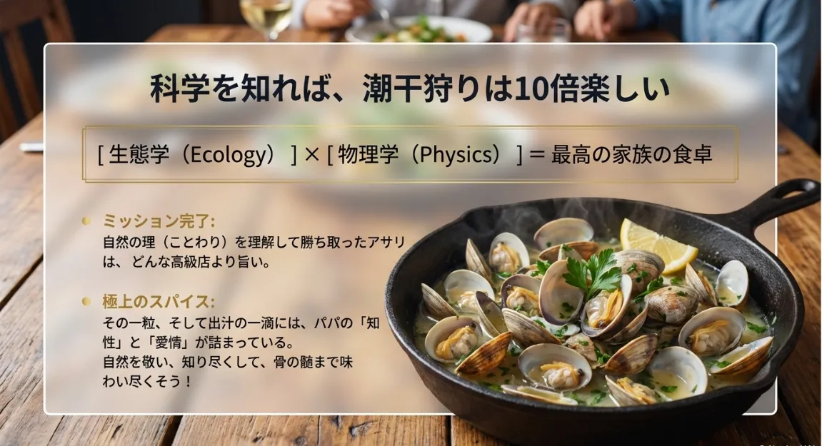 5月の潮干狩りは、単なる遊びを越えた、生命のサイクルに触れる貴重な体験です。アサリが必死に蓄えたグリコーゲン、GWの混雑がもたらす物理的負荷、そして産卵という命の継承。そのすべてを理解した上で獲った一粒は、どんなお店のアサリよりも輝いて見えるはずですよ。