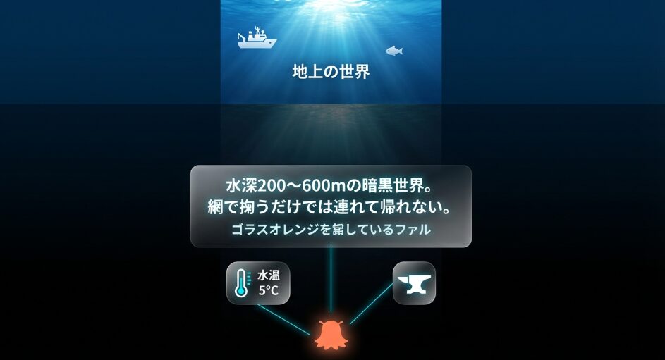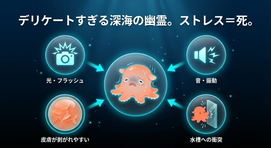 その理由は、彼らが暮らす水深500m〜600mという極限環境にあります。この暗黒の世界は、太陽光が届かず水温は約5度、反映して私たちの体には耐えられないほどの凄まじい水圧がかかっています。水族館で展示するということは、この特殊な環境を水槽の中に完璧に再現しなければならないということ。しかし、単に水を冷やして暗くするだけでは不十分なのです。メンダコは皮膚が非常に薄く、網で捕獲される際のわずかな擦れや、輸送時の揺れ、さらには水質の微細な変化だけで命を落としてしまうことが珍しくありません。つまり、「どこにいるか」という問いへの答えは、常に「捕獲に成功し、かつ奇跡的に生き延びている期間だけ、特定の場所にいる」という非常に不安定なものになります。