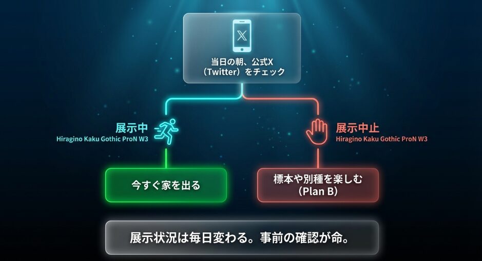 私自身、何度も「展示中」のニュースを見てから翌日に駆けつけたものの、すでに展示終了の看板が出ていて肩を落とした経験があります。彼らが水槽の中にいてくれること自体、何層ものハードルを越えた「奇跡」であることを、まずは心に留めておいてください。