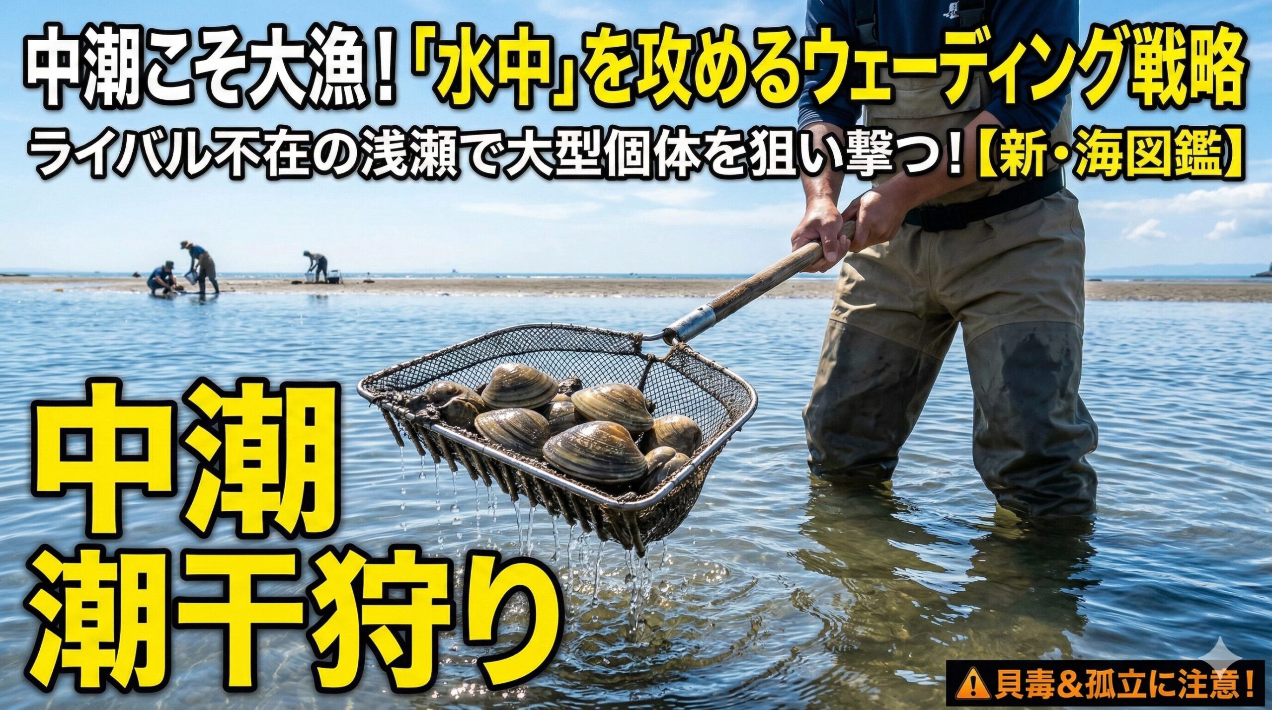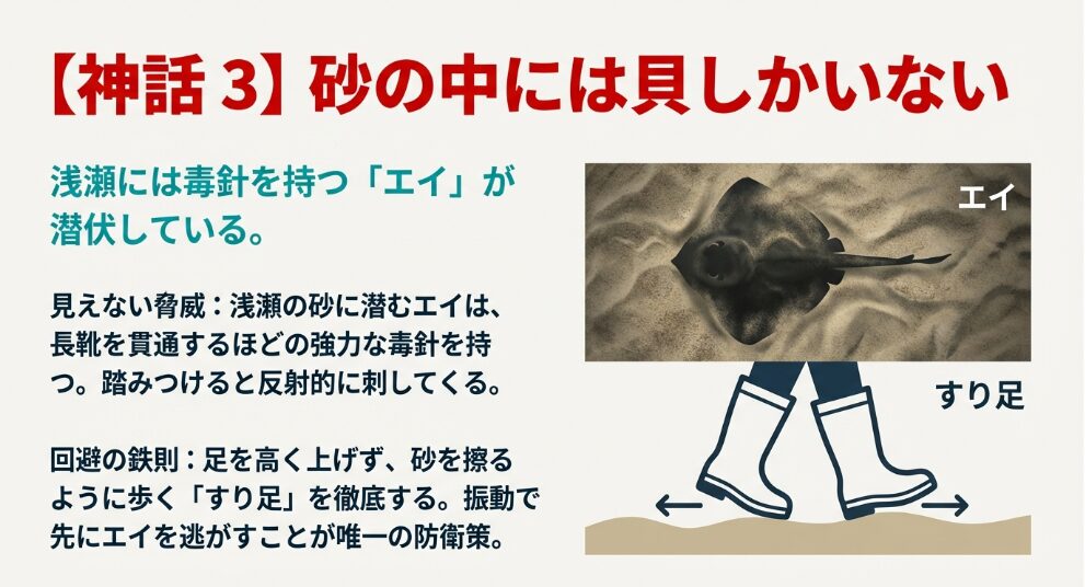 干出面積が狭い中潮は、ライバルが少ない「浅瀬(水中)」に大型個体が残っています。 ただし、貝毒の確認と「砂州の罠」による孤立対策だけは、家族のために徹底してください。