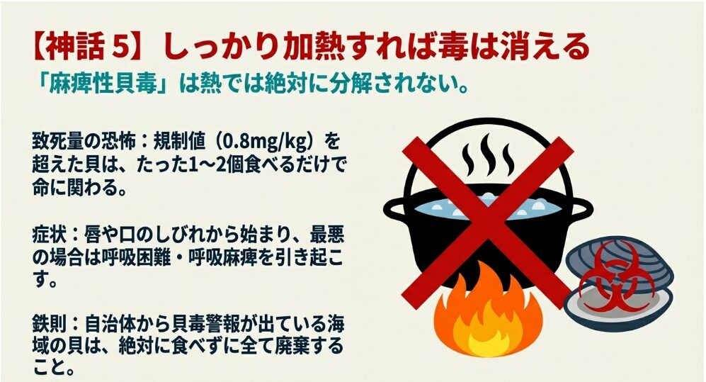 「しっかり火を通せば大丈夫でしょ?」と思われがちですが、実はこれが一番危険な誤解なんです。厚生労働省などの公的機関も警告している通り、麻痺性貝毒の主成分であるサキシトキシンは熱に対して非常に安定した構造を持っています。つまり、煮ても焼いても、毒素は一切消えることはありません。