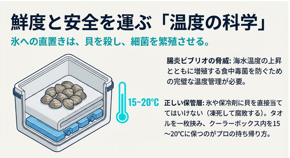 中潮の時期は気温が上がりやすいため、採った貝の鮮度管理は極めて重要です。食品安全委員会のデータでも、海水温の上昇に伴い「腸炎ビブリオ」などの食中毒リスクが高まることが示されています。高保冷力のクーラーボックスに保冷剤を敷き、貝を直接氷に触れさせないよう新聞紙などで包んで15〜20度程度を維持して持ち帰るのが、家族の健康を守るコツです。