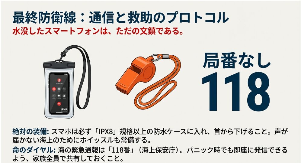 そして、パパ・ママに必ず持ってほしいのが「通信手段」です。万が一、潮に囲まれて孤立した際、すぐに「海の緊急電話118番」へ通報できるよう、スマホは必ずIPX8等級の完全防水ケースに入れて身につけておいてください。また、声が届かない波音の中でも存在を知らせる「レスキューホイッスル」をライフジャケット等に忍ばせておくだけで、家族の生存率は飛躍的に高まります。