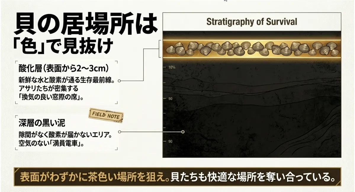 元屋敷公園の泥質底は、砂浜に比べて「隙間」がほとんどありません。そのため、地中の深いところまで酸素が届きにくいという物理的な制約があります。アサリたちが呼吸をするためには、表面からわずか2〜3cmの、酸素が残っている層に居続けなければなりません。