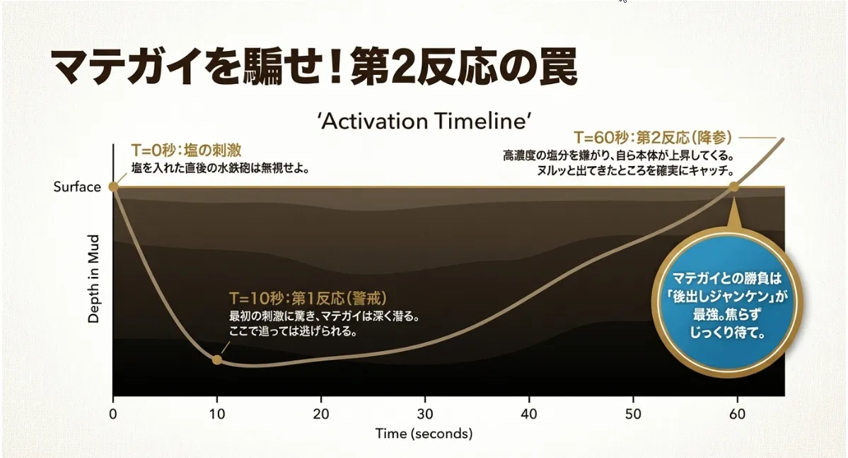 塩を投入してから30秒から1分、じっと我慢して穴を観察し続けてください。すると、マテガイが塩分濃度の上昇を嫌がって、ヌルッと本体を突き出してくる「第2反応」が起こります [cite: 1]。この瞬間こそが、確実にキャッチできる絶好のチャンス。この「待ち」の時間こそが、野生との駆け引きを楽しめる最高にガチな瞬間なんです。
