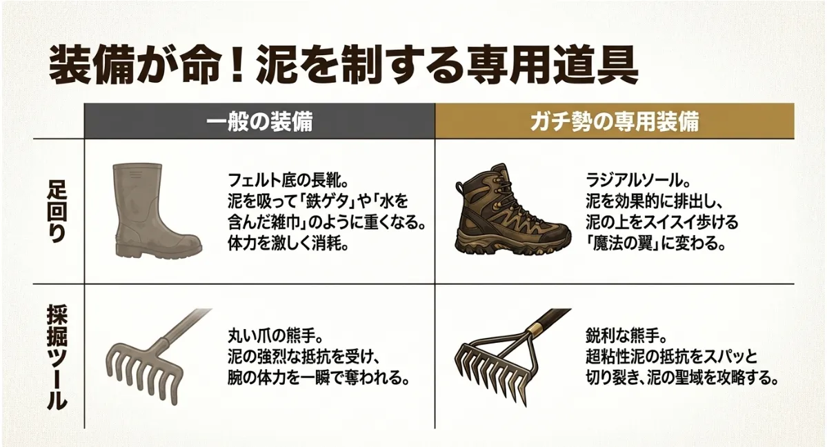 元屋敷公園特有の粘性泥は、貝の生存戦略そのものです。泥の層が薄い「酸素供給スポット」を見極め、装備を最適化することで、短時間で爆釣を狙えます。