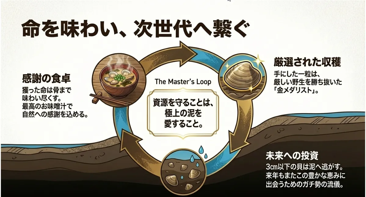 泥だらけになって、足の重さに耐えながら手に入れた一粒のアサリ。そこには日光川の恵みと、過酷な環境を生き抜いた生命の力強さが宿っています。家に帰って砂抜きをした後、酒蒸しやお味噌汁にして口にした瞬間のあの「旨味」は、都会のスーパーで買ったものとは比べものにならないはずです。
