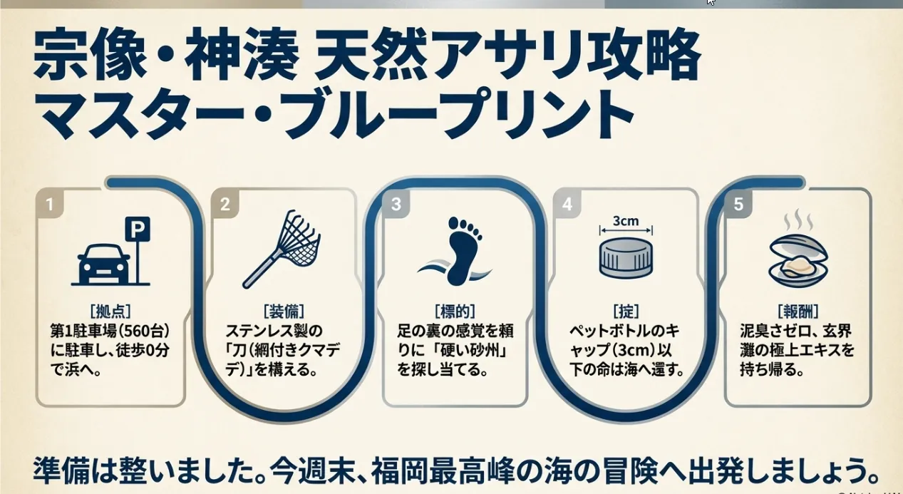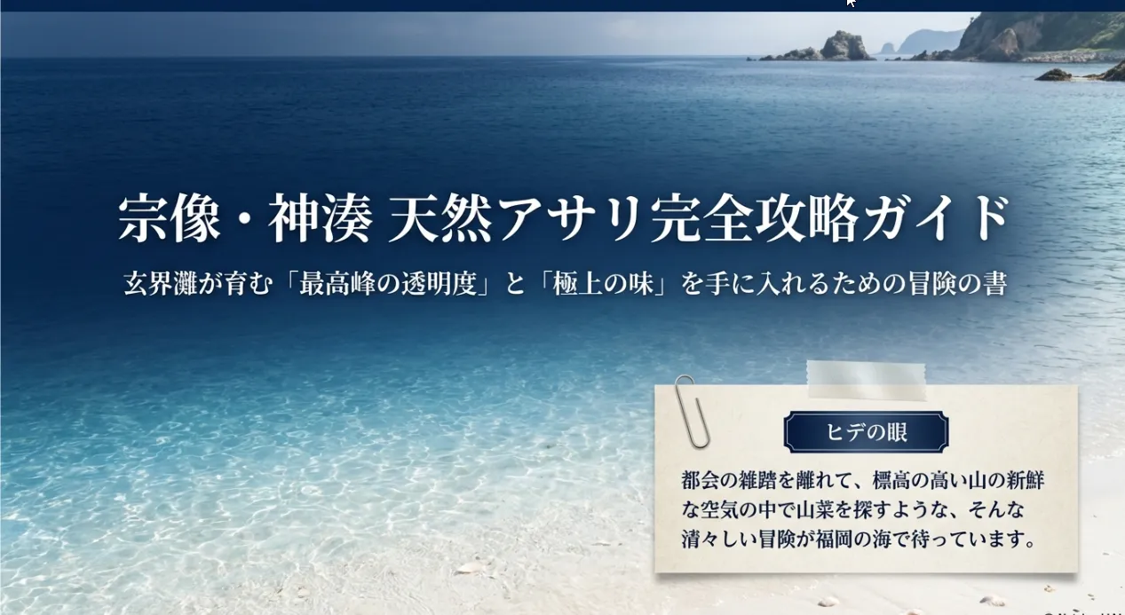 天候という自然の「許可証」をしっかり確認し、万全の装備で臨んでください。泥汚れを気にせず、クリスタルクリアな水辺で家族と笑い合う休日。そんな贅沢な体験が、ここ宗像にはあります。次の大潮、凪の日を狙って、ぜひ「本物の天然アサリ」を探しに出かけてみてください。応援しています!