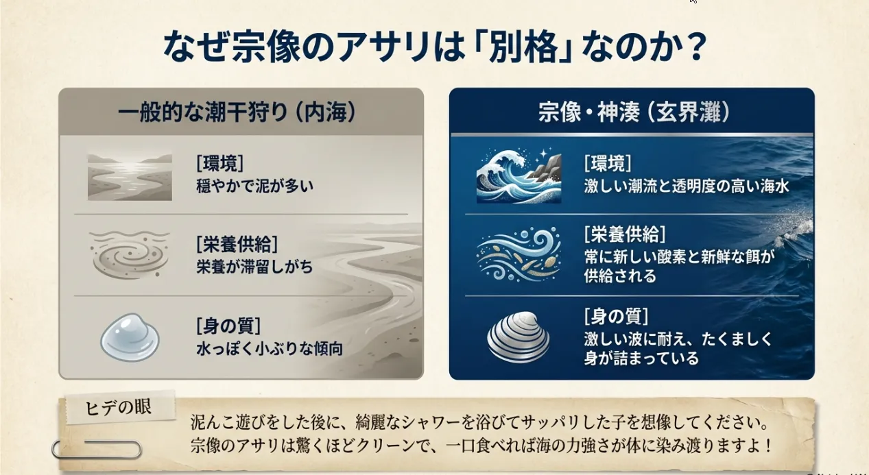宗像・神湊周辺の最大の特徴は、なんといっても「水の美しさ」です。多くの潮干狩り場が泥混じりの内湾にあるのに対し、ここは玄界灘に面したオープンな海岸。海水が常に循環しているため、透明度が抜群に高いんです。そんな清冽な水の中で育つアサリは、身がギュッと締まっていて、貝特有の臭みもほとんどありません。