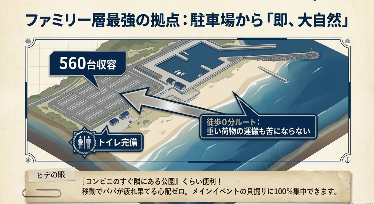 宗像の潮干狩り、特に神湊周辺がファミリーに嬉しいのは、アクセスの良さです。神湊漁港の第1駐車場(約560台収容)は、12時間利用してもわずか300円。ここから砂浜までは目と鼻の先なんです。重い道具を抱えて長距離を歩く必要がないのは、パパにとって大きな加点ポイントですよね。