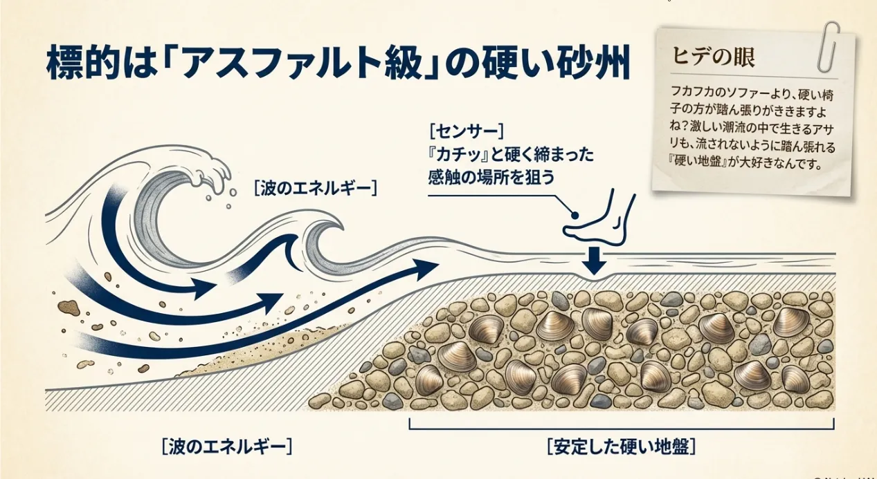 宗像での潮干狩りで一番驚くのは、砂の「硬さ」かもしれません。玄界灘の強い波によって常に砂が攪拌され、細かい泥が洗い流されているため、足元の砂が非常に引き締まっているんです。アサリはこの硬い砂の中に潜り込み、激しい潮流に流されないよう必死に踏ん張っています。つまり、アサリがいる場所は「波のエネルギーを耐え忍んでいる場所」なんです。